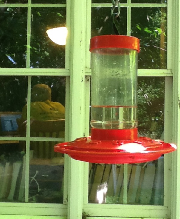 I hear activity in the kitchen, then silence. The hummingbird comes around again. Still no nectar?