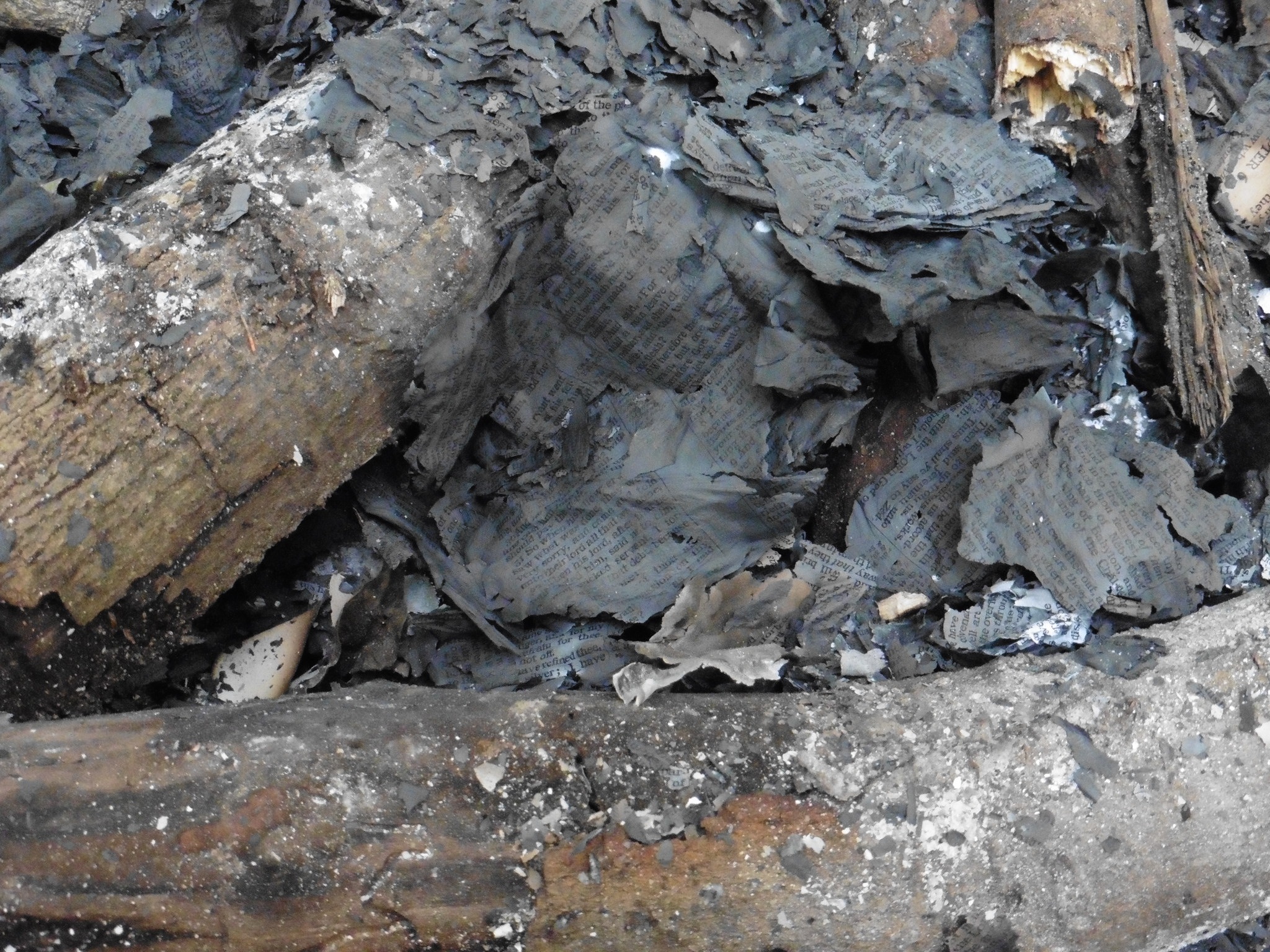 Finally, when one of the Bibles had burned down to the spine, I rebuilt the fire with a few sticks and placed the other, half-burnt text on top. This, finally, seemed like a proper cremation. For a few moments the fire was grand and only a little smoky as the Bible crumbled into fragile ash bearing traces of words.