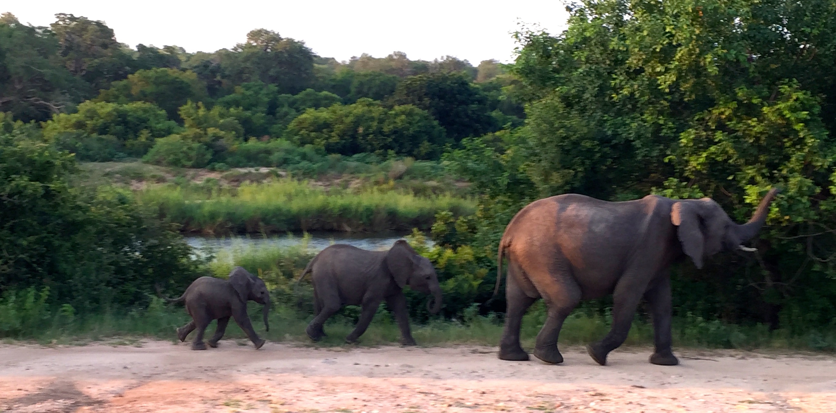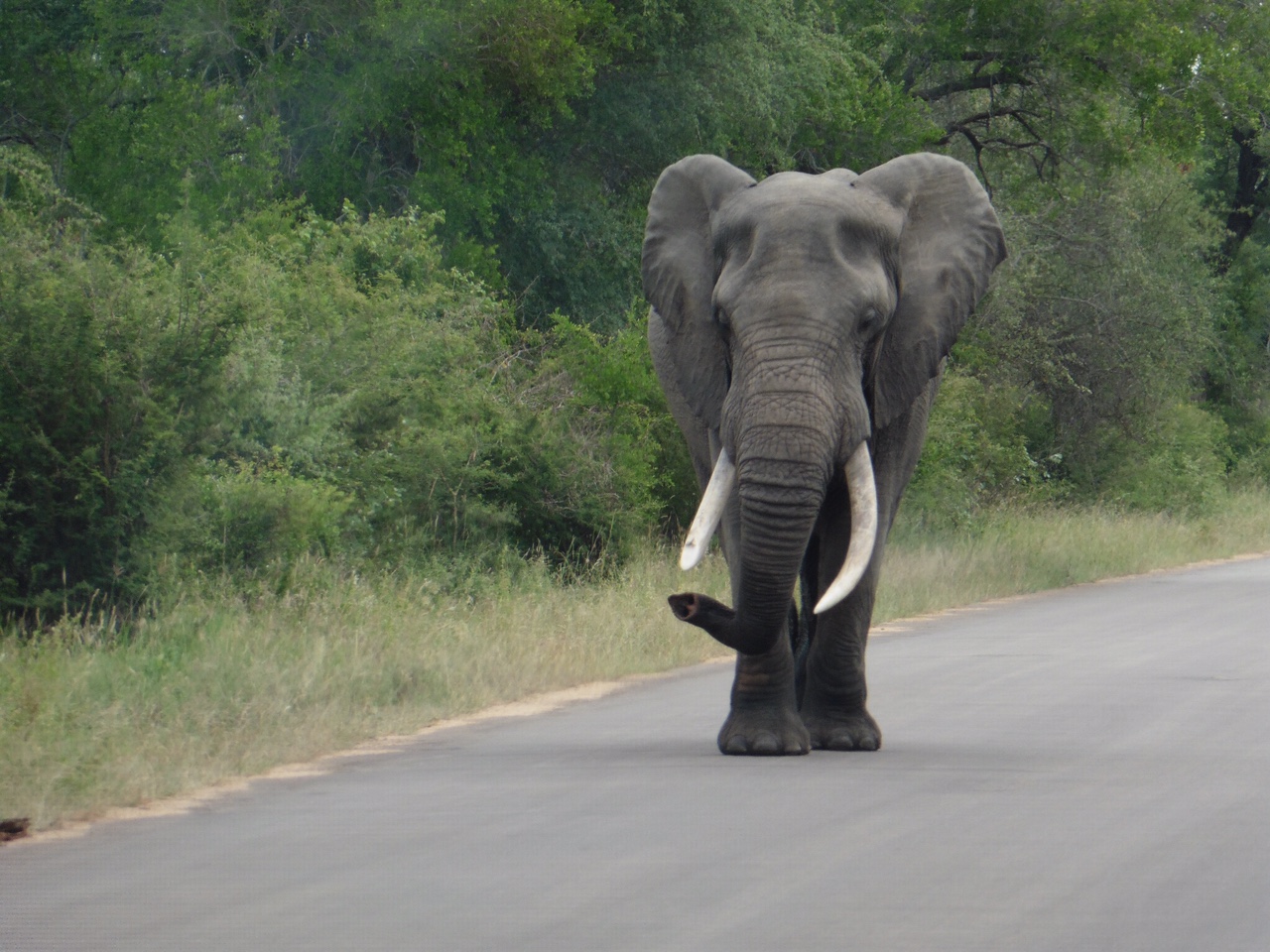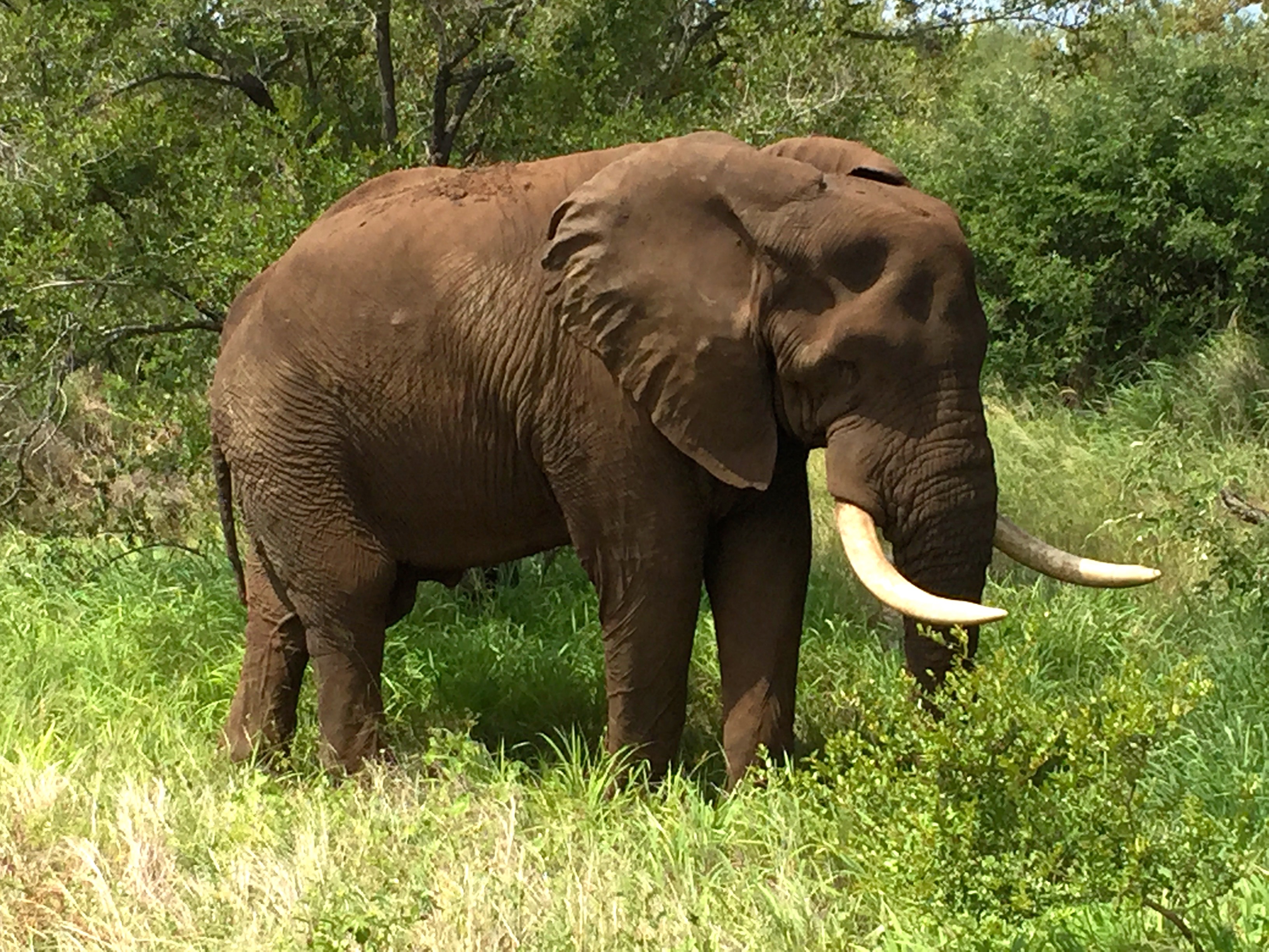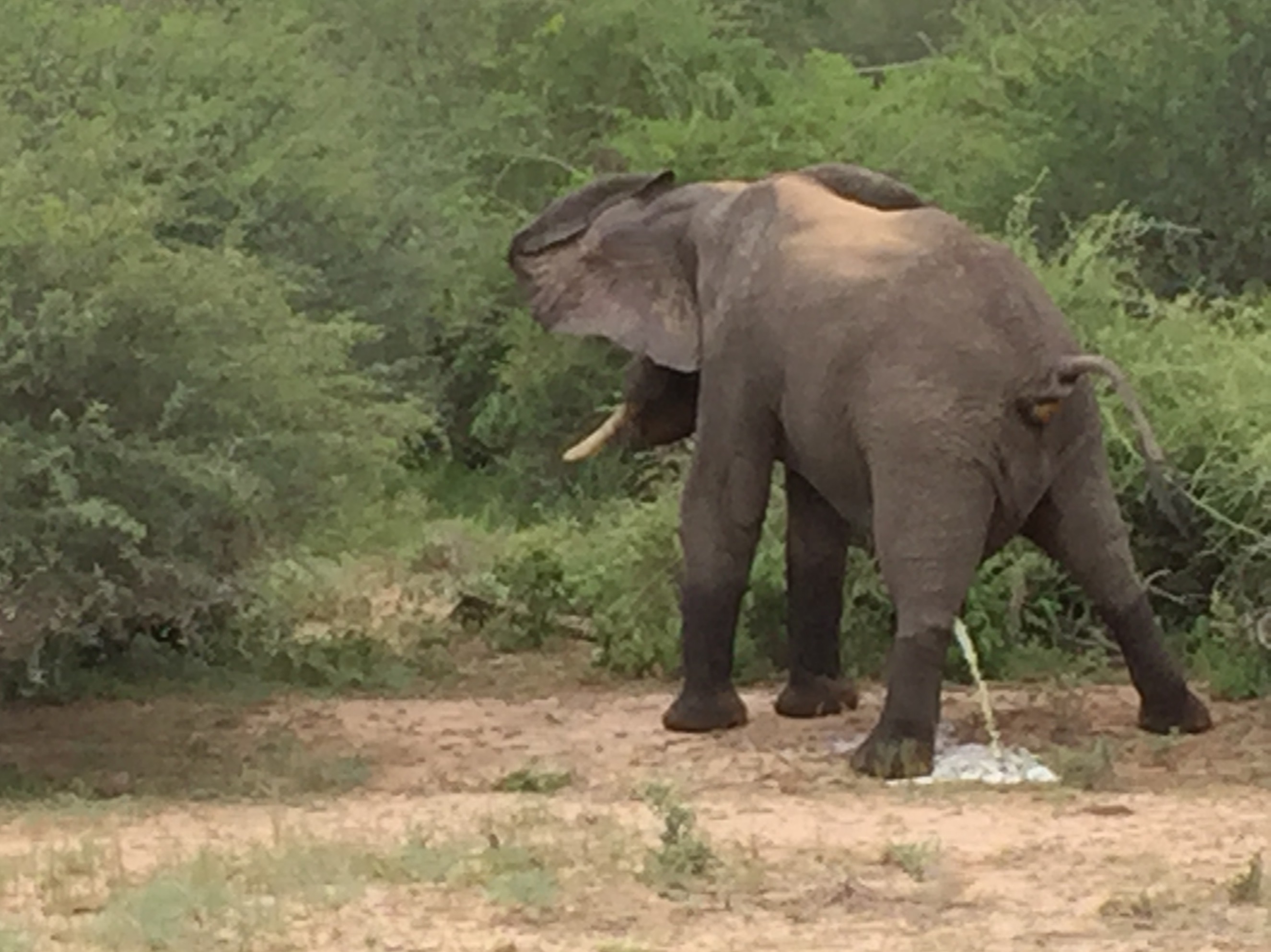 Here are two story pictures. They are of bull elephants in musk. The first one is striding purposefully down the road, oblivious to the cars or maybe defying them. He is peeing constantly, like the elephant in the second picture is doing. Both of them are emitting a strong odor, like a whole zoo full of animals. (We saw many elephants up close and only these two stank.) Our guide told us these were dangerous elephants. You don’t want to be facing these critters, who are out looking for mates. In the first picture we were parked next to a T-road so we could make a quick escape if the elephant took a notion to charge.