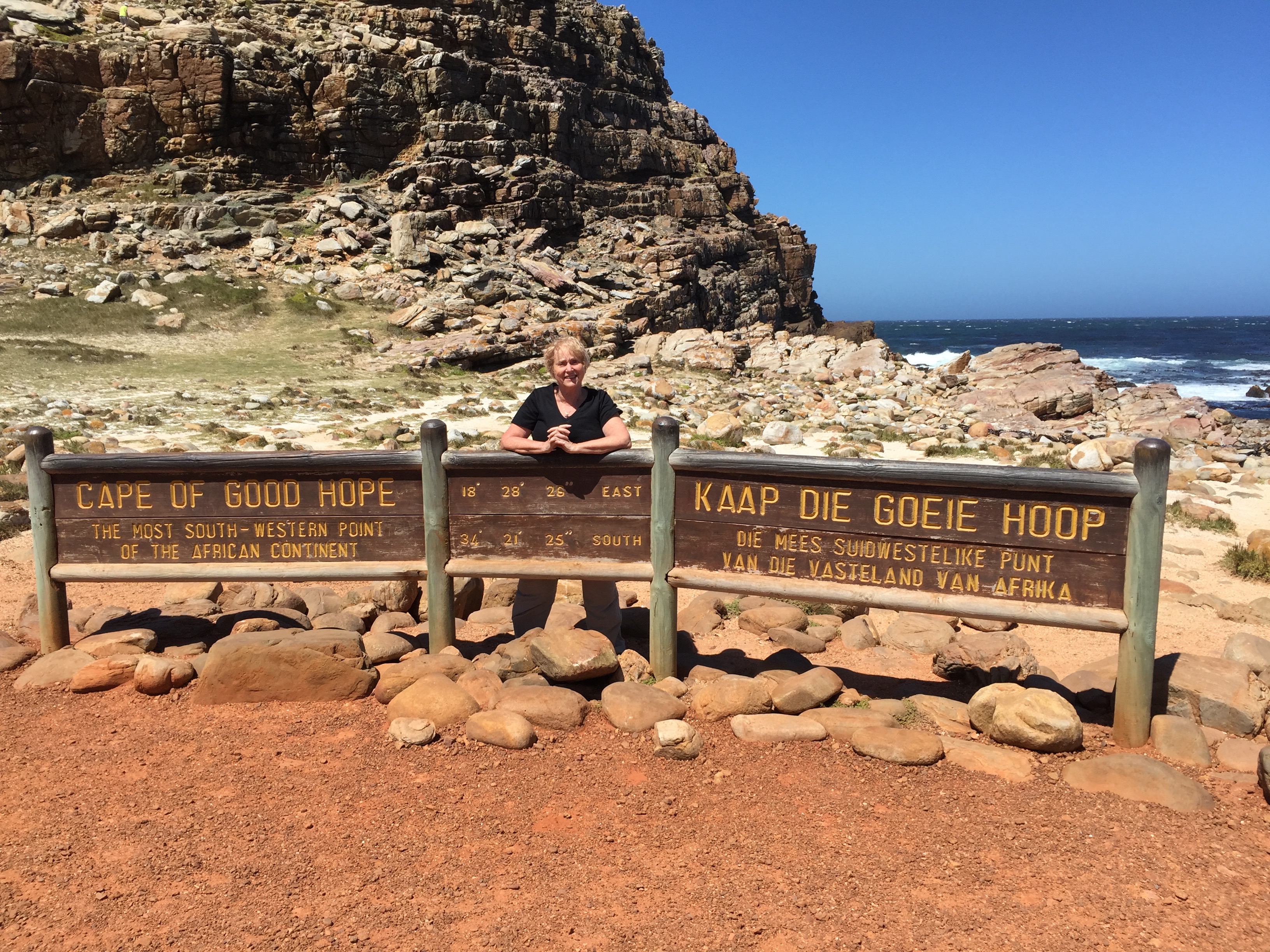 The pictures help me remember the experience. Being stared at by teenage giraffes; waiting for hippos to surface; watching the elephant family parades, the herds and herds of impalas, the mamas and babies of all species; and driving for hours through the majestic vastness of the habitat dedicated to these glorious animals–all of this was awesome. Impressive. An incredible privilege. This is me posing at the legendary Cape of Good Hope, rounded first by Vasco da Gama at the end of the 15th century.