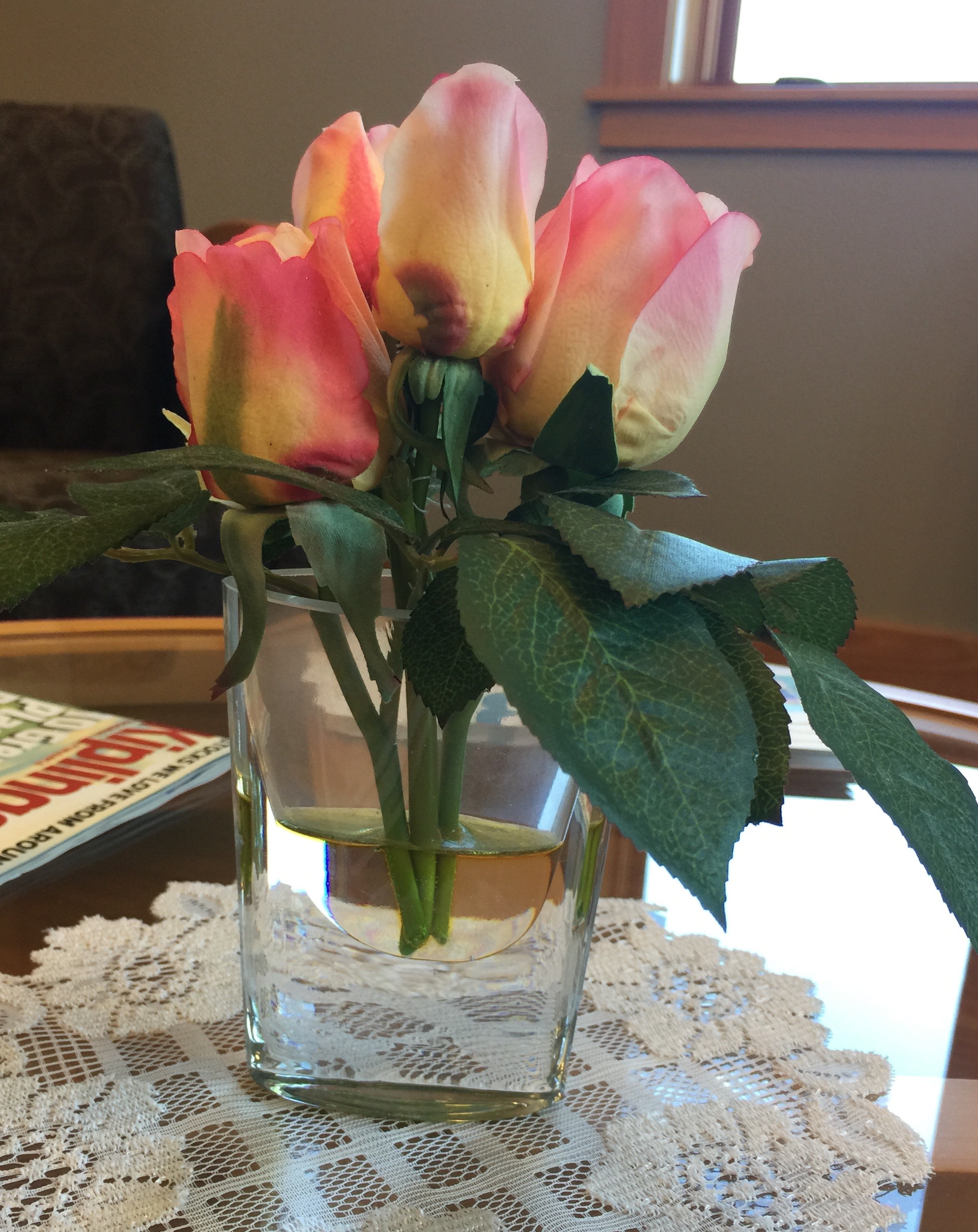 Meanwhile, today I am continuing to enjoy being nonjudgmental. In most things, that is. Sitting in a waiting lounge this morning I saw these artificial roses, arranged in a vase half full of plastic “water” –truly offensive to my aesthetic sensibilities. It called forth my full, judgmental wrath against fake flowers.